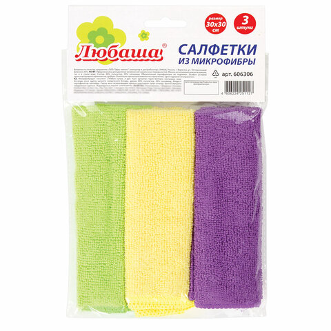 Салфетки универсальные, КОМПЛЕКТ 3 шт., микрофибра, 30х30 см, 180 г/м2, ЛЮБАША "ЭКОНОМ", 606306 описание
