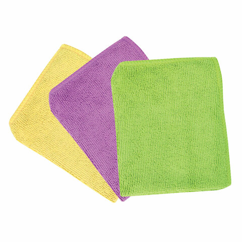 Изготовлены из микрофибры плотностью 180 г/м2. Размер – 30х30 см. Поставляются комплектом из трех штук в пакете с европодвесом.